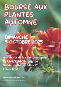 L’association l’Herbe folle de Griesbach organise sa traditionnelle Bourse aux plantes d’automne le dimanche 5 octobre 2025 de 14h à 17h, aux abords de la salle des fêtes du village.