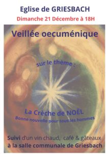 La paroisse de Griesbach vous propose, le dimanche 21 décembre à 18h en l’église du village, une veillée œcuménique sue le thème de la Crèche de Noël.