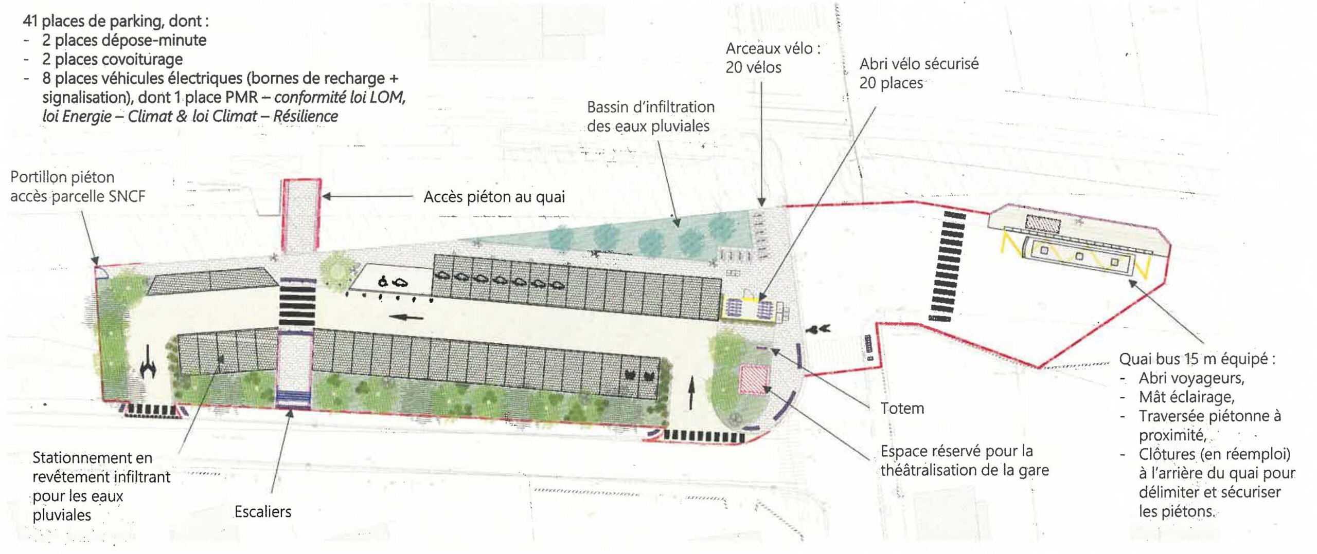 - L’augmentation à 41 véhicules légers (y compris places PMR (Personne à Mobilité Réduite)) de l’offre de stationnement.