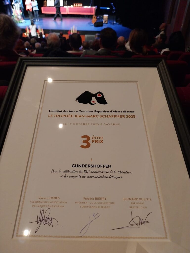 - En août 2021 la commune de Gundershoffen s’est engagée à promouvoir l’alsacien de manière générale sur son ban en signant, en présence du Président de l’OLCA M.Justin Vogel, la charte « Ma commune dit Ja ». Pour l’occasion, l’artiste Jean-Pierre Albrecht est venu interpréter ses plus grands succès et M. Noé nous a conté l’Histoire de notre commune. Pour voir le reportage sur cet événement : https://www.tv3v.fr/VOD/Actus3V/Actus-3-septembre-2021-seYO6fDMhQ.html?fbclid=IwAR1ampsfaYf-DbpgYedBHZfqJ_B8LD5lU6CK_-YX6acchT58NYTR5qcmtQY